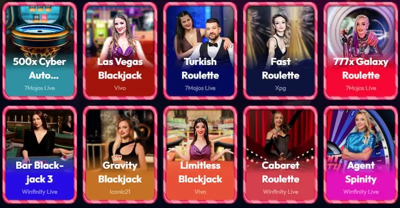 De live casino sectie biedt honderden tafels met echte dealers gefilmd vanuit professionele studio’s. Evolution Gaming, Pragmatic Play Live, Vivo Gaming en 7Mojos Live voeden deze meeslepende categorie. Spelers hebben toegang tot klassiekers zoals blackjack, roulette en baccarat in meerdere versies.