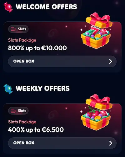 Het welkomstpakket is verdeeld over 6 stortingen voor een totaal van 800% tot €10.000. De inzetvereisten zijn 20x op alleen het bonusbedrag. Slots dragen 100% bij aan de wagering.